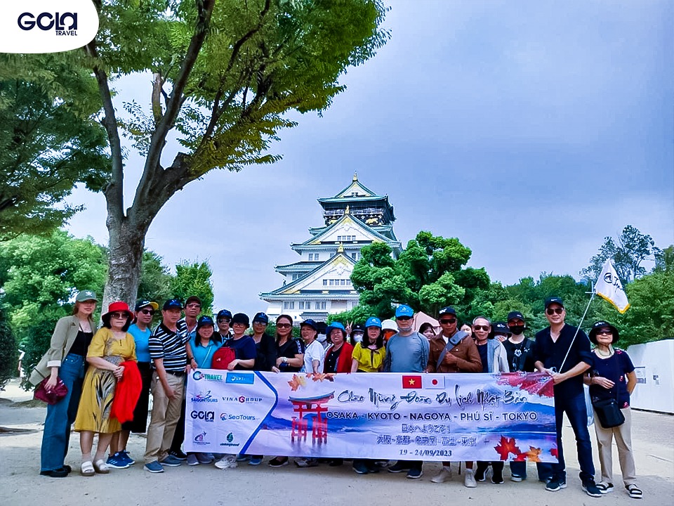 Đoàn khách check-in tại Lâu đài Osaka