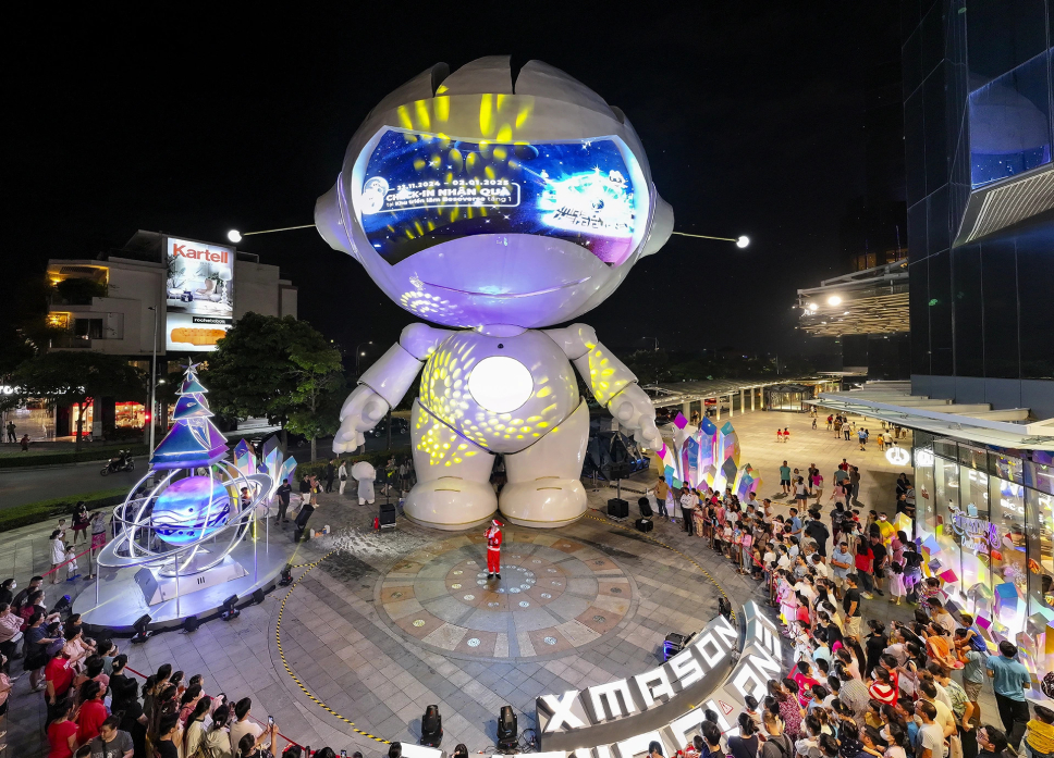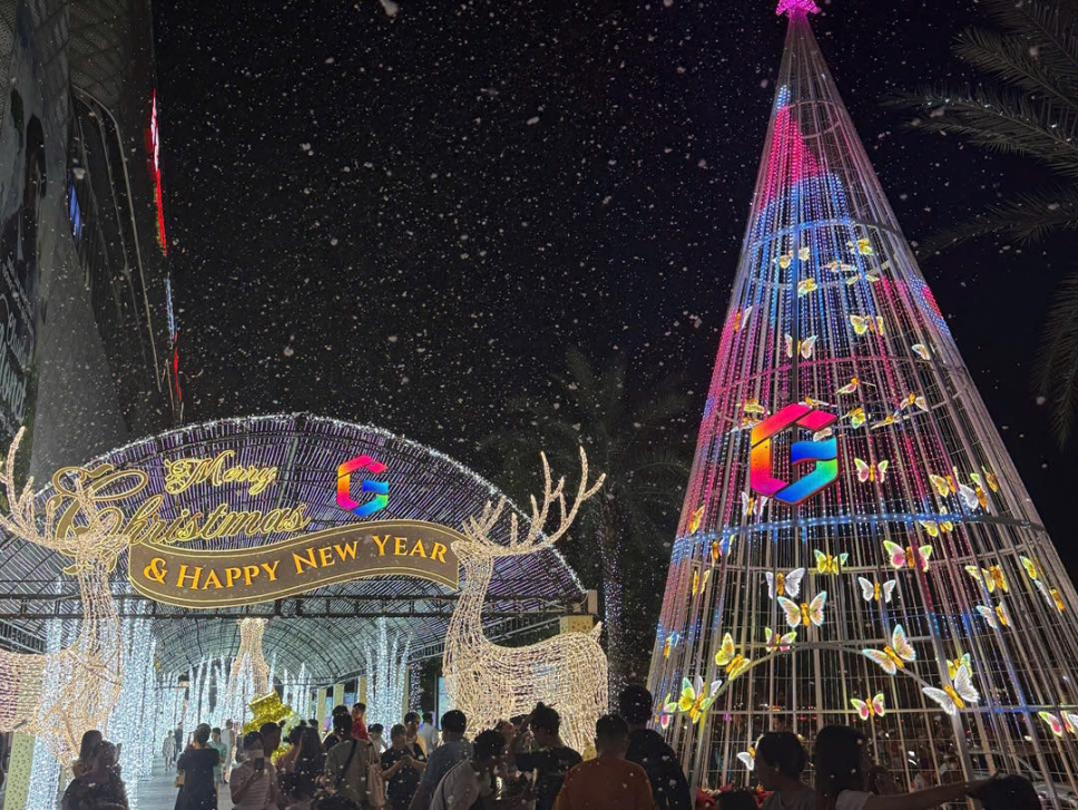 Với không gian Giáng sinh có diện tích lên đến 1.000m², Giga Mall mang đến cho khách hàng một khung cảnh Giáng sinh lấp lánh với những màn trình diễn ánh sáng đặc sắc. Với chủ đề "Magical Christmas" đã biến nơi đây thành một bữa tiệc ánh sáng rực rỡ, sử dụng công nghệ đèn LED đầy hiện đại mang đến một trải nghiệm thị giác đặc biệt cho khách hàng. Tại khu vực lối vào, bạn sẽ bị cuốn hút bởi cây thông khổng lồ cao 9.5m, được thắp sáng bởi hàng ngàn bóng đèn LED kết hợp cùng hiệu ứng chuyển động bắt mắt. Bên cạnh đó, các biểu tượng Giáng sinh quen thuộc như ông già Noel, người tuyết, và gấu Bắc Cực được cách điệu với phiên bản ánh sáng hoàn toàn mới lạ, mang đến những góc check-in ấn tượng dành riêng cho tín đồ “sống ảo”. Điểm nhấn đặc biệt tại Giga Mall chính là hoạt động phun tuyết khiến bạn như lạc bước vào khung cảnh Giáng sinh tuyết trắng đầy mơ mộng như Xứ trời Âu.