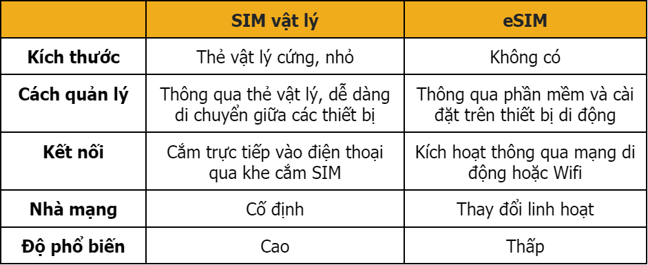 Khác với SIM vật lý thông thường, eSIM không phải là một linh kiện riêng lẻ mà được gắn trực tiếp bên trong máy bởi nhà sản xuất. Với kích thước nhỏ, gọn tiện lợi hơn so với SIM vật lý truyền thống, sau đây là sự khác nhau giữa SIM vật lý và eSIM: