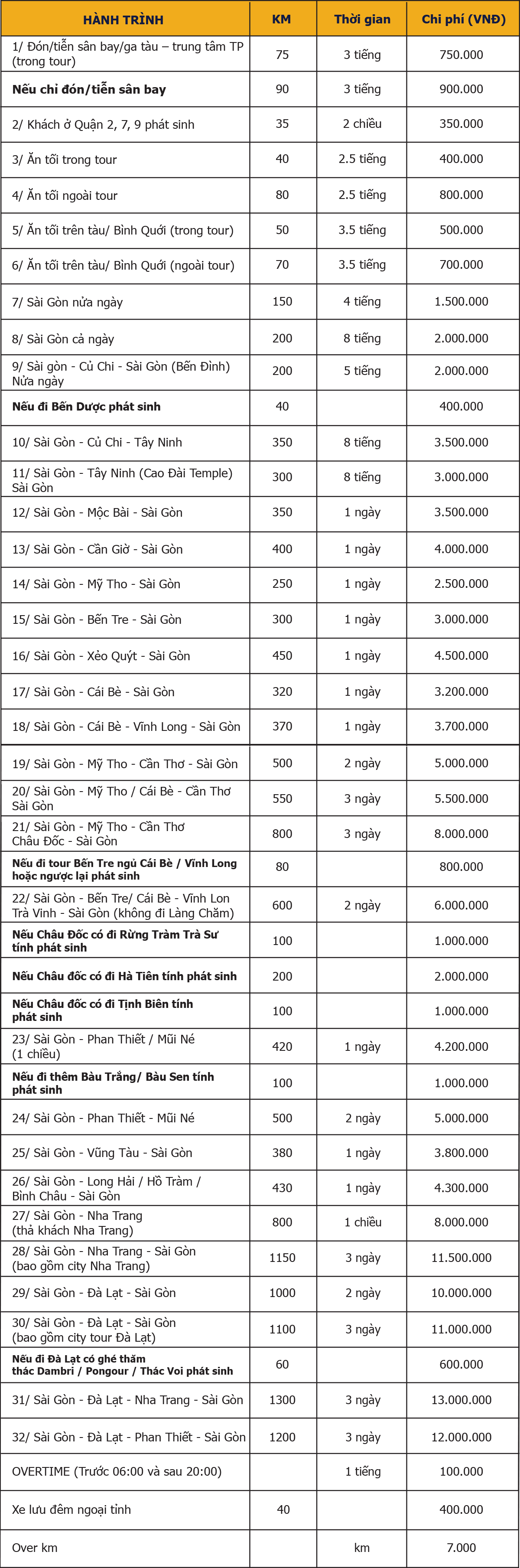- Xe đi ngoại tỉnh, đã tính bao gồm phục vụ đi ăn tối tới 21h00 hằng ngày.