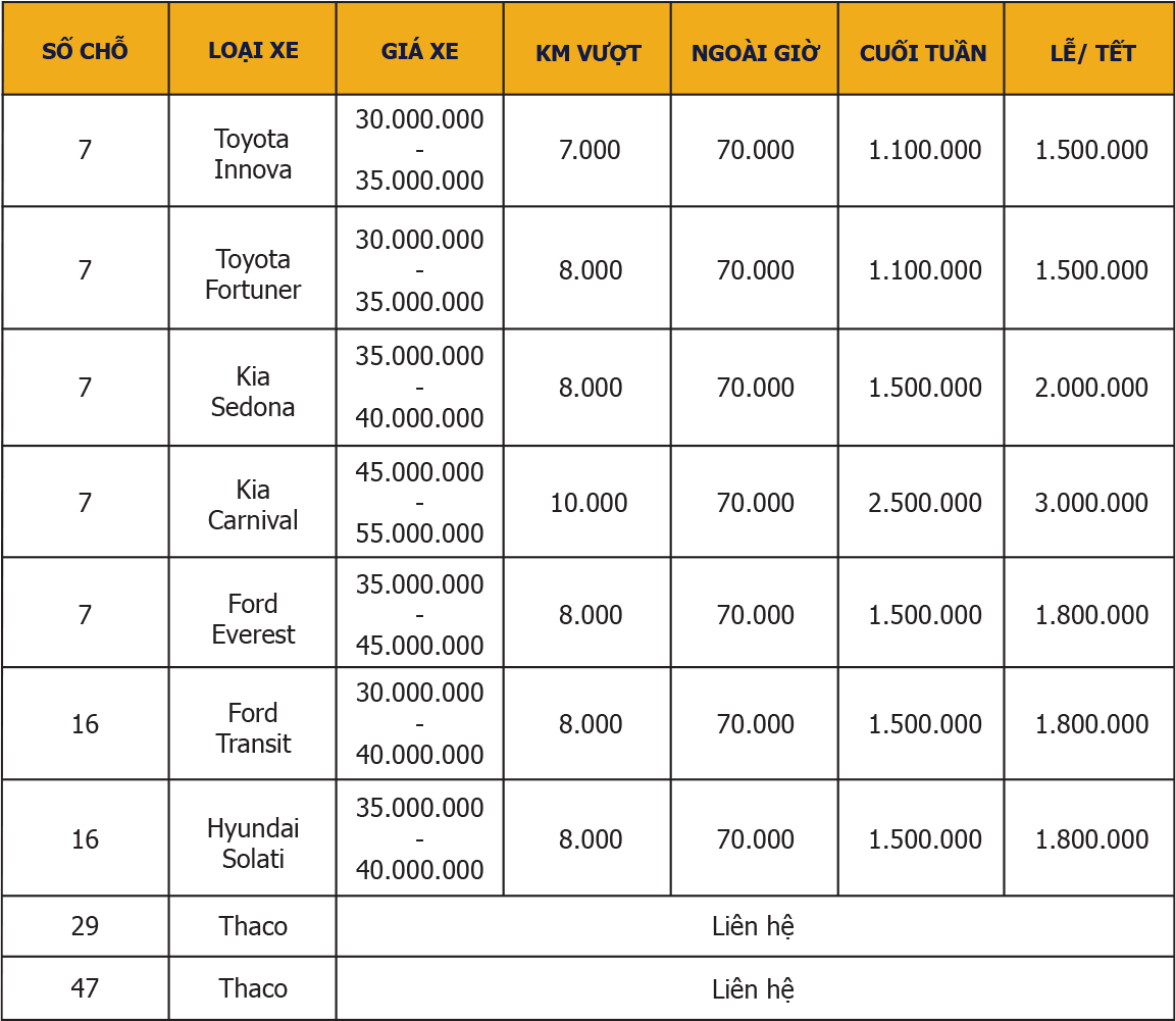 - Không bao gồm Thuế VAT và phí cầu đường.